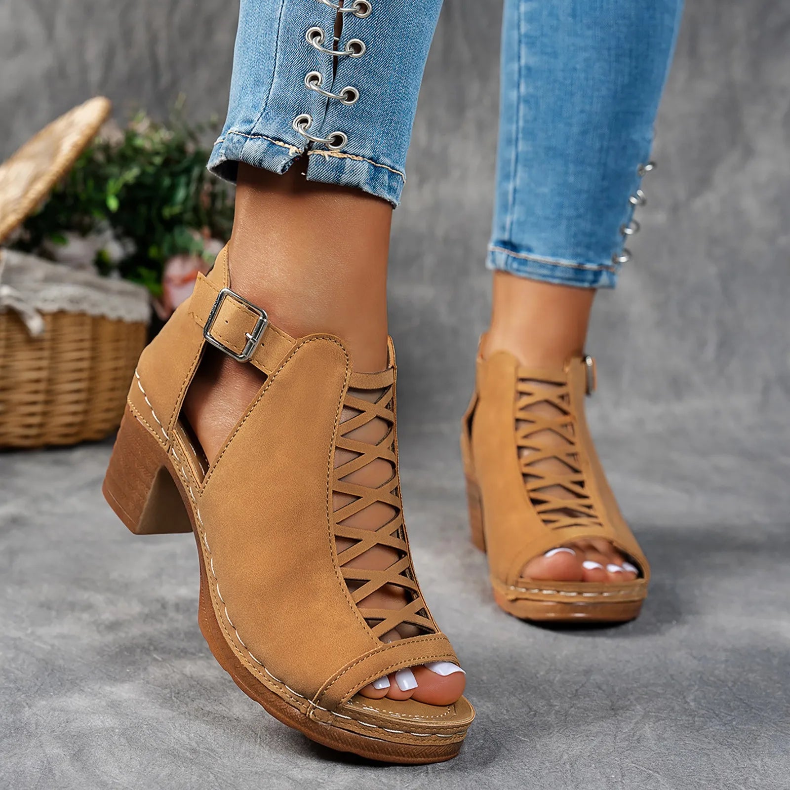 She dresses like her life is already a success story in motion, and these heels are the chapter where she stops apologizing. The laced front and open-toe cut frame the foot with confident geometry, balanced by a sturdy wedge for long hours on the move. A secure buckle and soft lining keep every step controlled and comfortable from workdays to whatever follows.